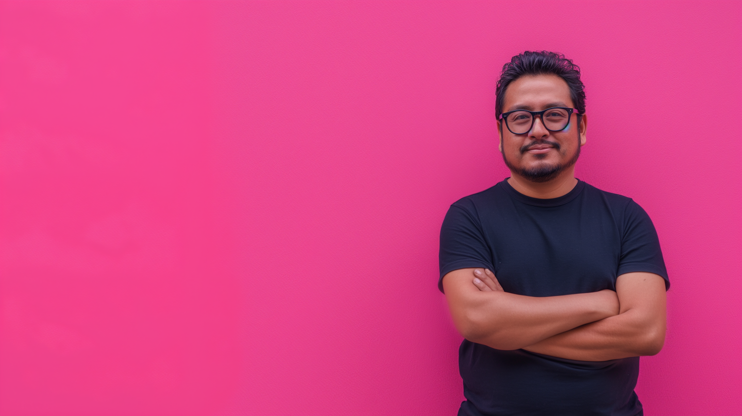 Man with glasses and beard in black t-shirt against a vibrant pink background, arms crossed, confident expression.