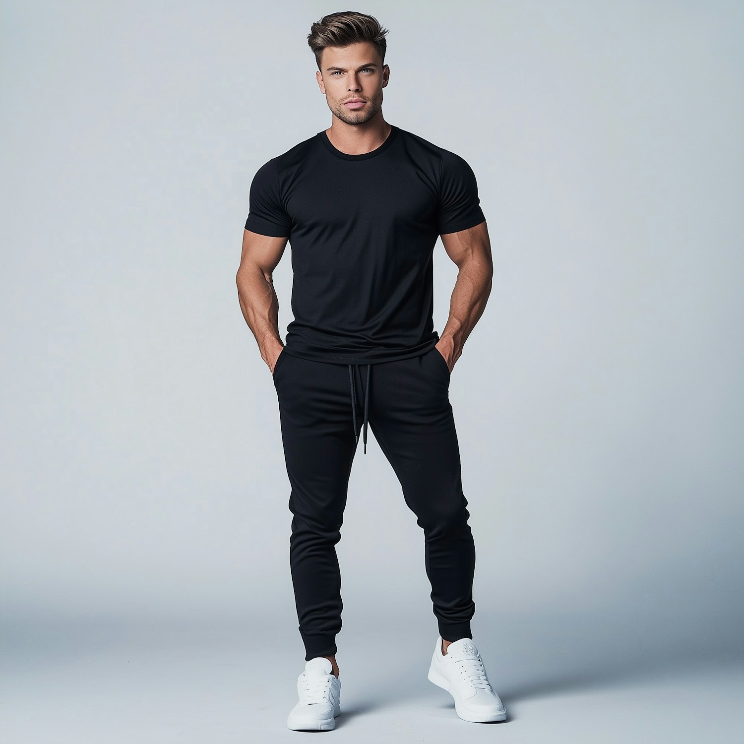 Man in black t-shirt and joggers with white sneakers, standing confidently against a plain gray background.