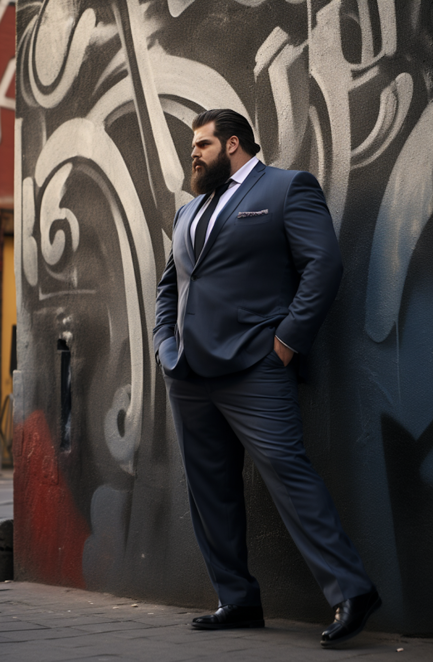 Stylish man in a blue suit stands against a graffiti wall, exuding confidence and sophistication in an urban setting.