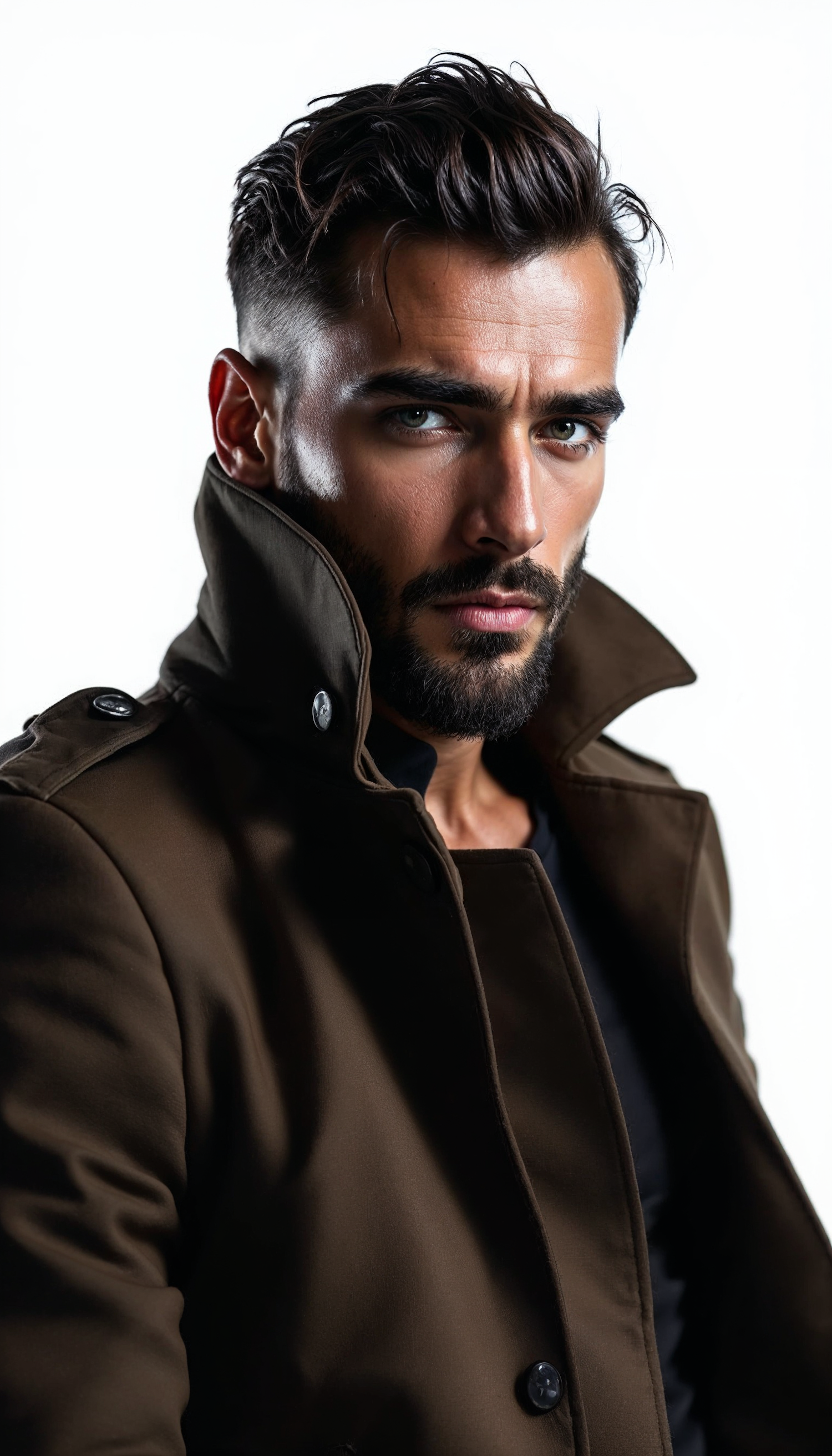 Caucasian man with blue eyes and dark hair in a brown coat, intense gaze, and a well-groomed beard against a white background.