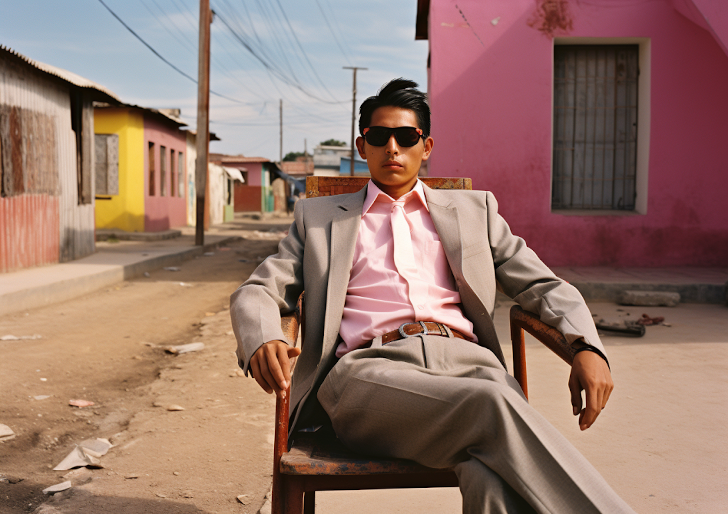 Stylish man in a gray suit and sunglasses sits confidently on a colorful street, blending elegance with a rustic backdrop.