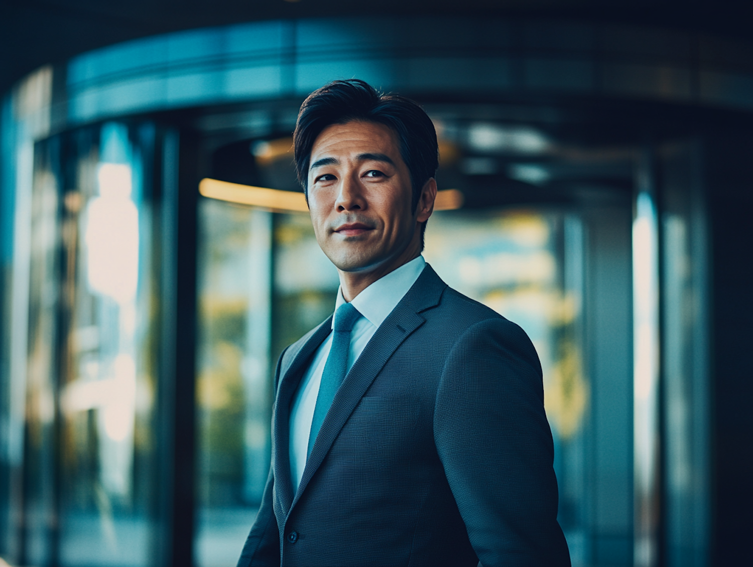 Confident Asian man in a suit with a light blue tie, standing in a modern corporate setting with glass architecture.