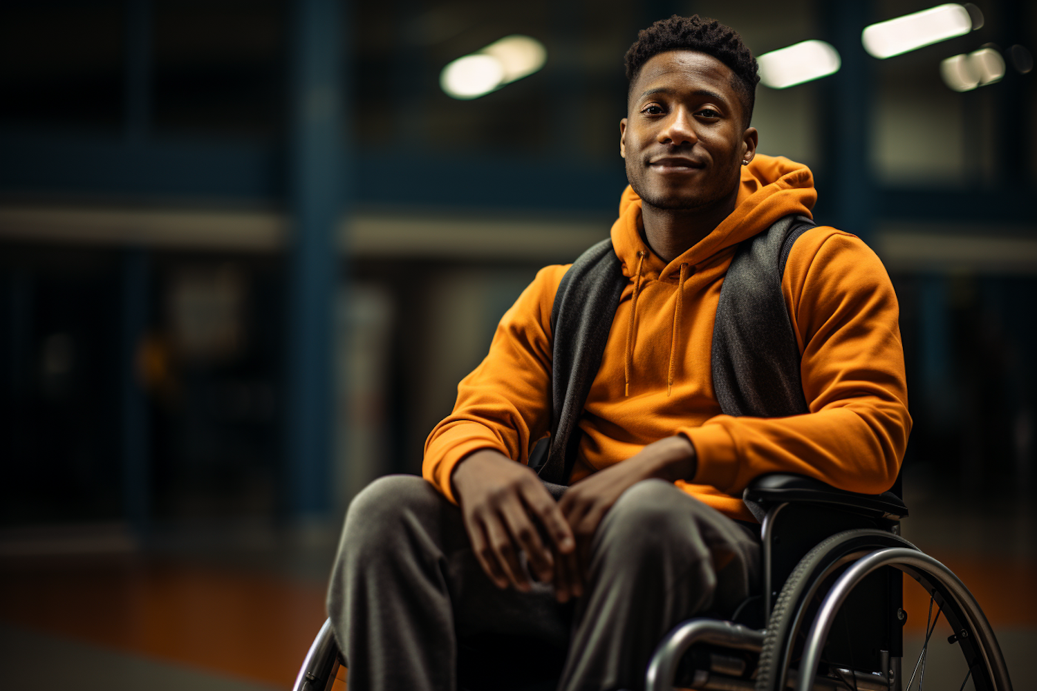 Young Black man in an orange hoodie sitting in a wheelchair, exuding confidence and calm in a softly blurred indoor setting.