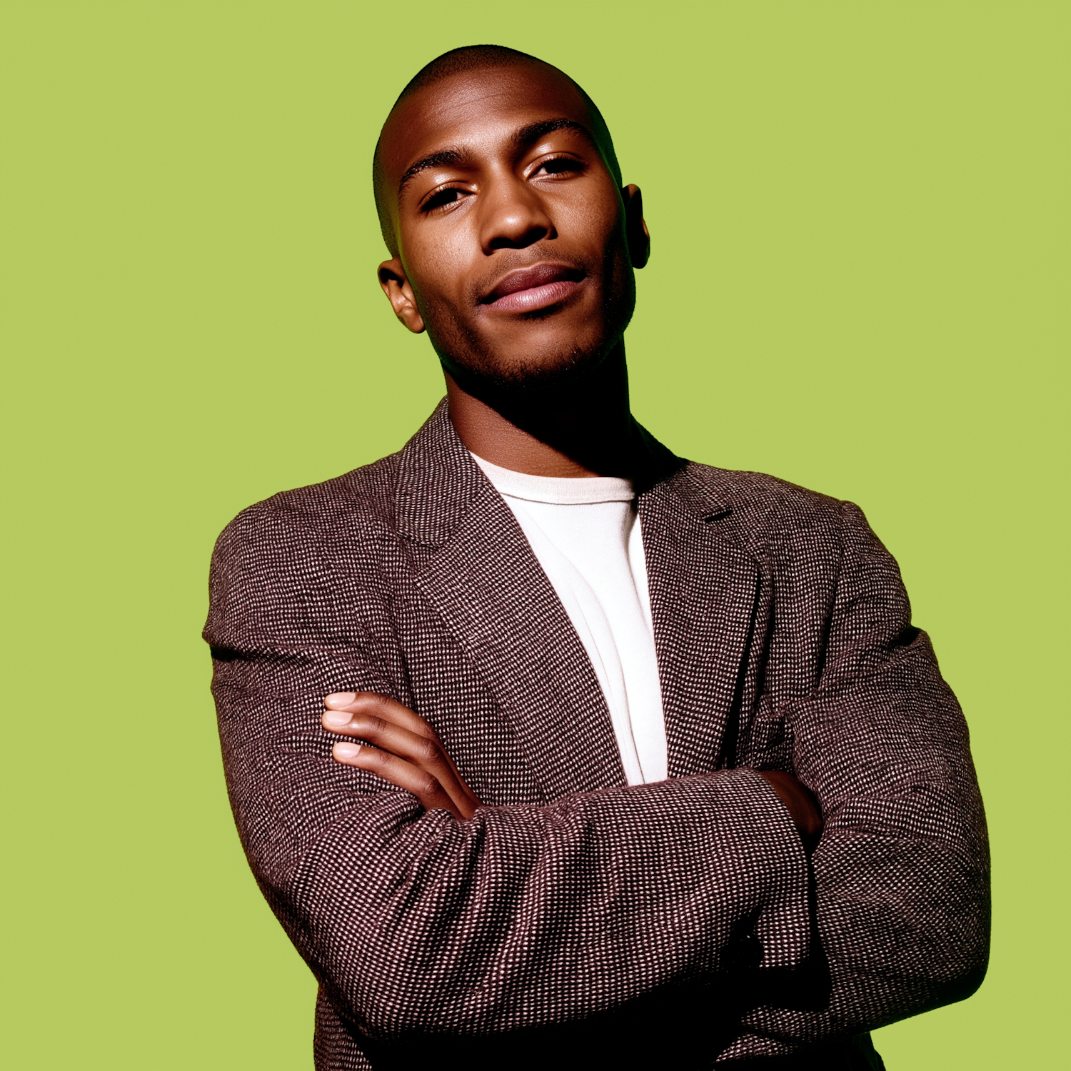 Confident man in a brown blazer and white shirt, standing against a bright green background with arms crossed.
