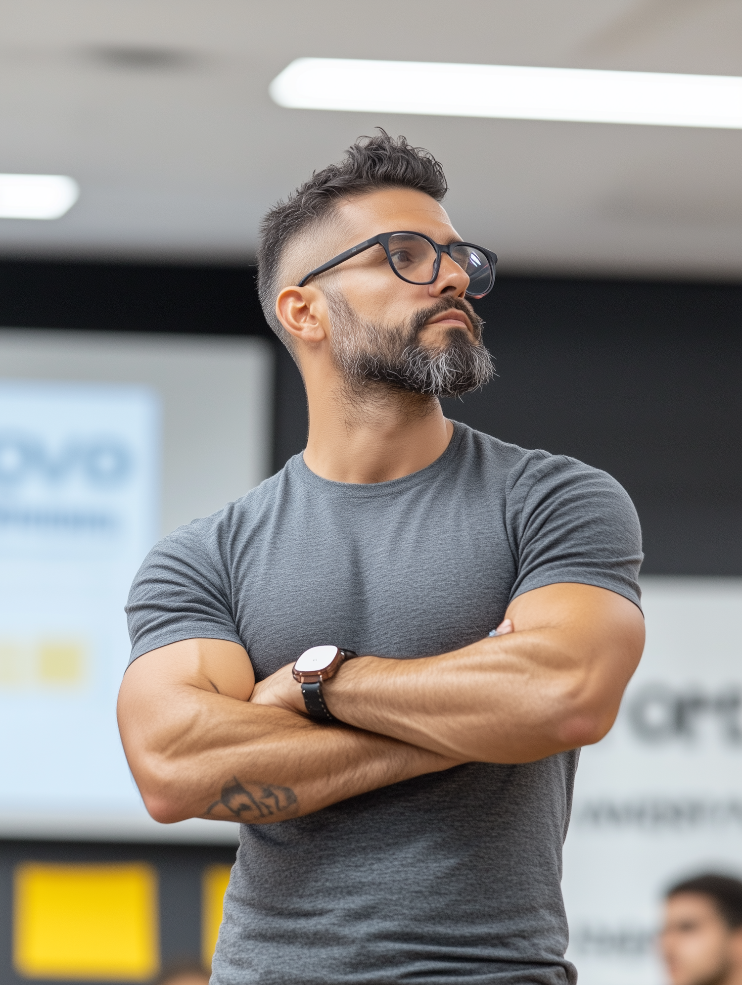Confident man with beard and glasses in a gray t-shirt, arms crossed, in a modern indoor setting.