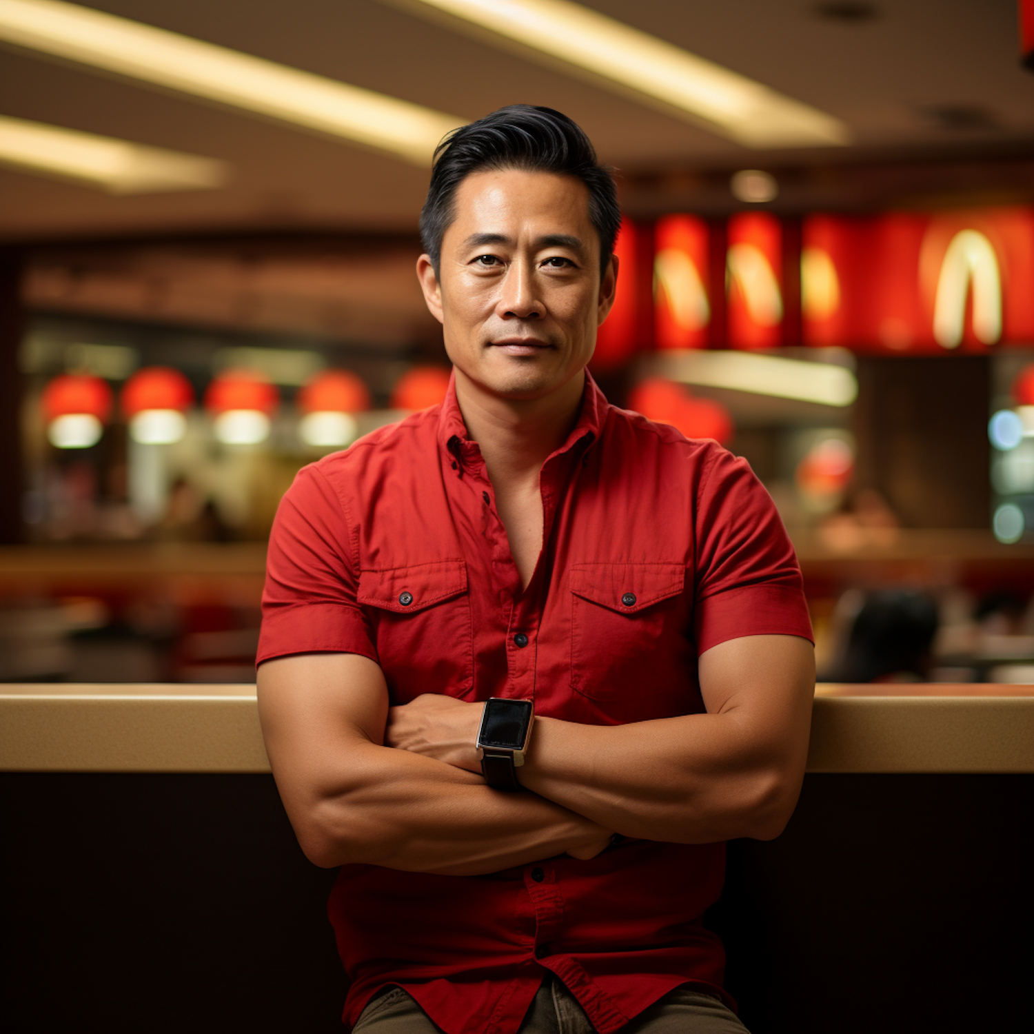 Asian man in red shirt with smartwatch, standing confidently in a fast-food restaurant with red and yellow decor.