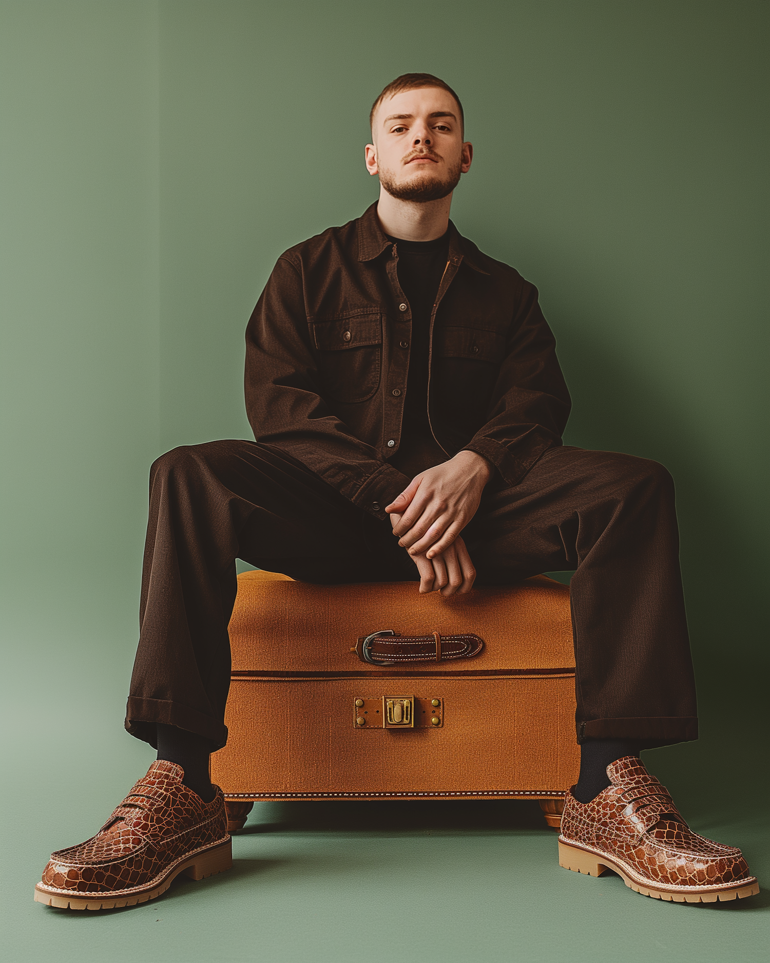 Young man in brown outfit sitting on a leather trunk, wearing stylish crocodile-patterned shoes against a green background.