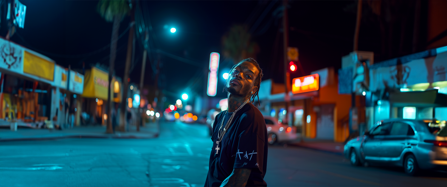A man with braids and a cross necklace stands on a neon-lit street at night, surrounded by colorful storefronts and parked cars.