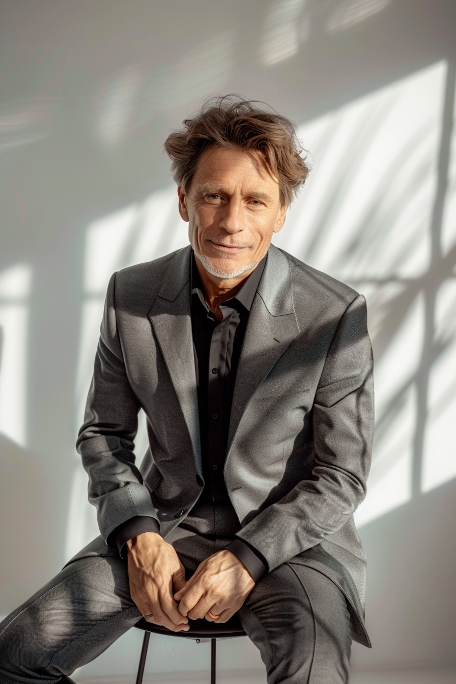 Caucasian man in a gray suit sits confidently on a stool, with soft shadows creating an elegant atmosphere.