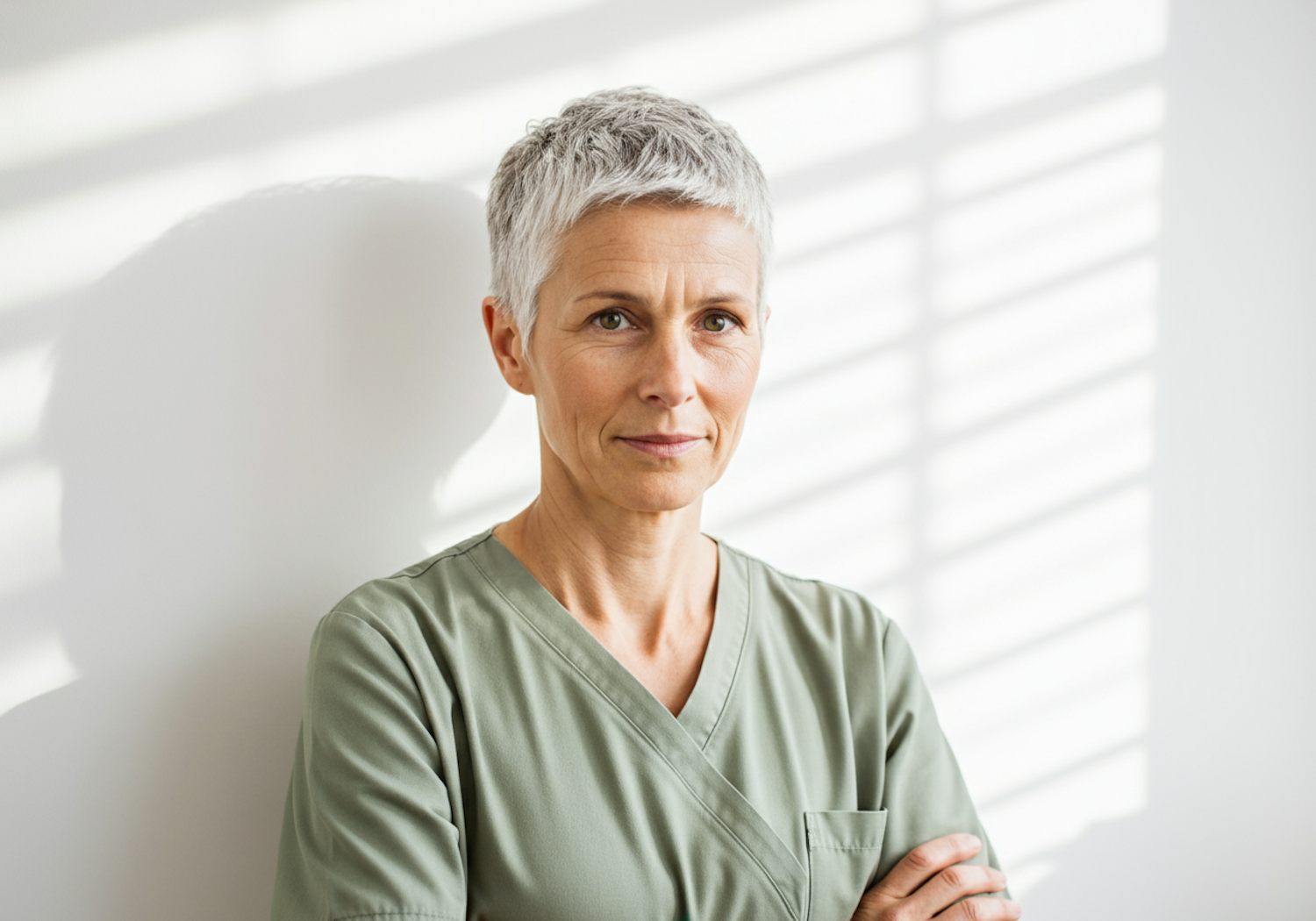 Confident woman in light green scrubs standing against a white wall with striped shadows, exuding professionalism and calmness.