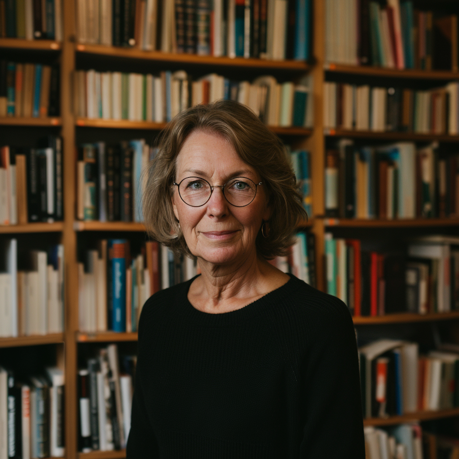 Middle-aged woman with glasses in front of a bookshelf, wearing a black sweater, exuding a scholarly and composed presence.