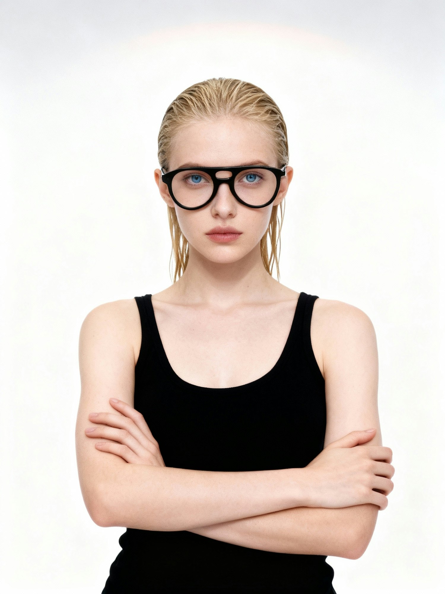 A young woman with slicked-back blonde hair, wearing black glasses and a tank top, poses confidently against a white background.