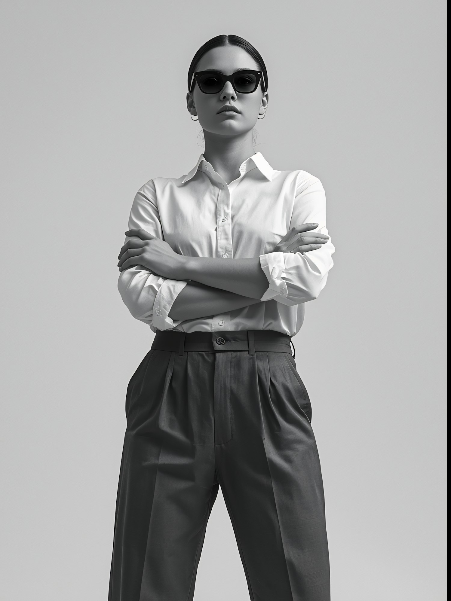 Monochrome portrait of a person in a white shirt and dark trousers, wearing sunglasses, standing confidently with arms crossed.