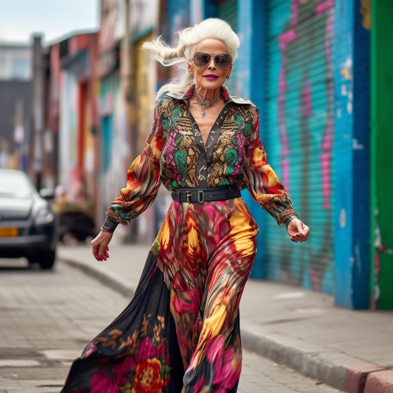 Confident older woman in a vibrant floral dress walking through a graffiti-filled urban street, exuding elegance and style.