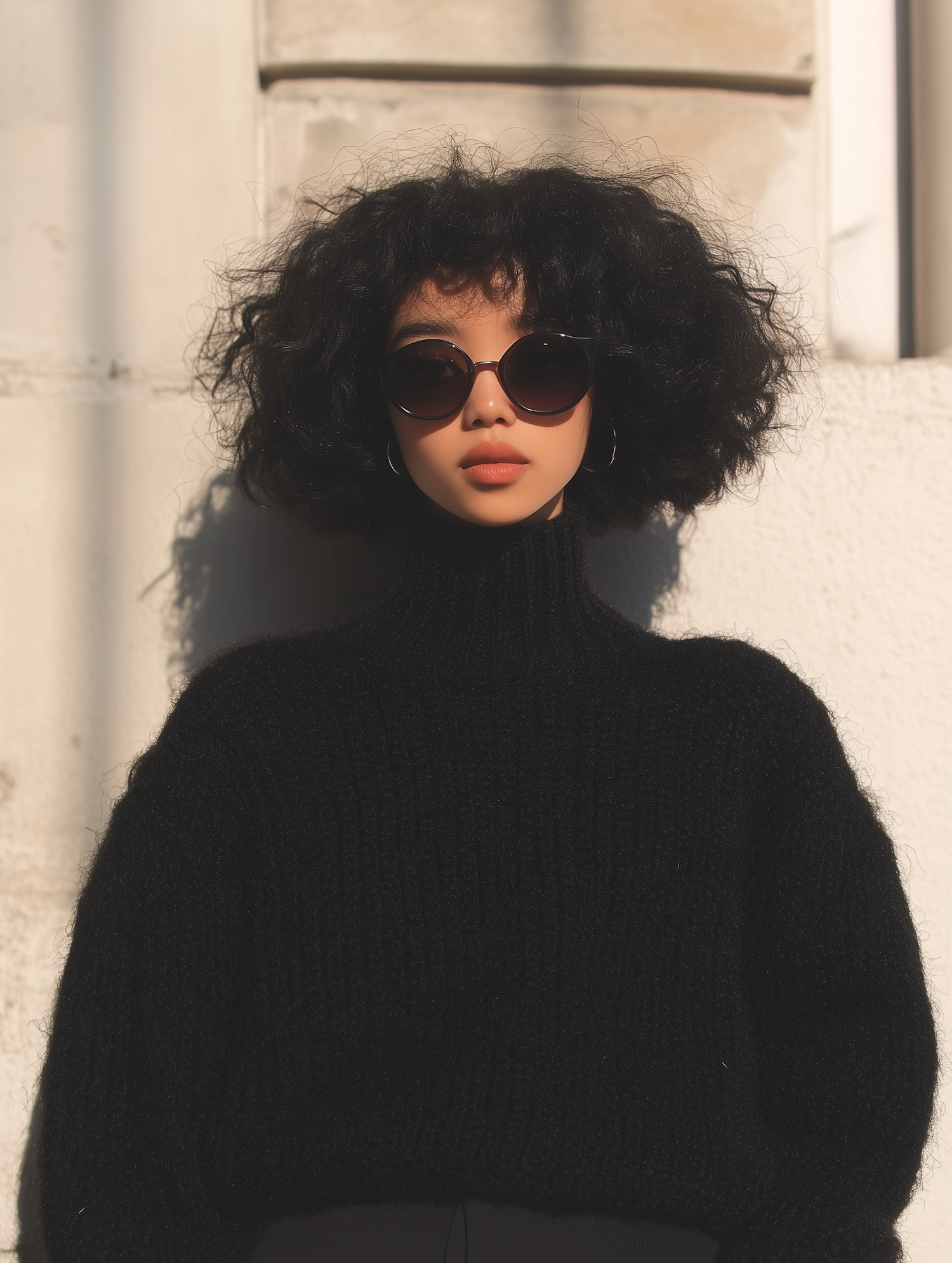 Stylish woman with curly hair and sunglasses in a black turtleneck, exuding confidence against a light wall.