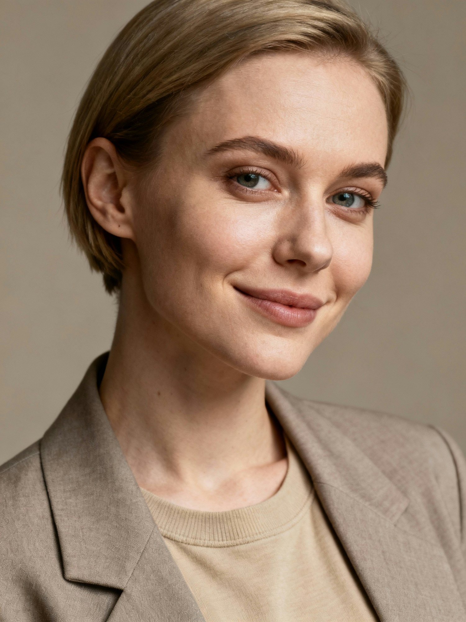 Studio portrait of a russian woman data scientist in her early thirties; light skin; neat short hair; slate beige blazer over beige crew; three-quarter head-and-shoulders (~10° off-axis), eyes to camera; tight head-and-shoulders close-up; neutral seamless backdrop; Rembrandt lighting; 105mm macro-sharp detail; photorealistic, editorial. Expression: subtle half-smile. Negative: “youthifying” skin blur, exaggerated wrinkle removal.