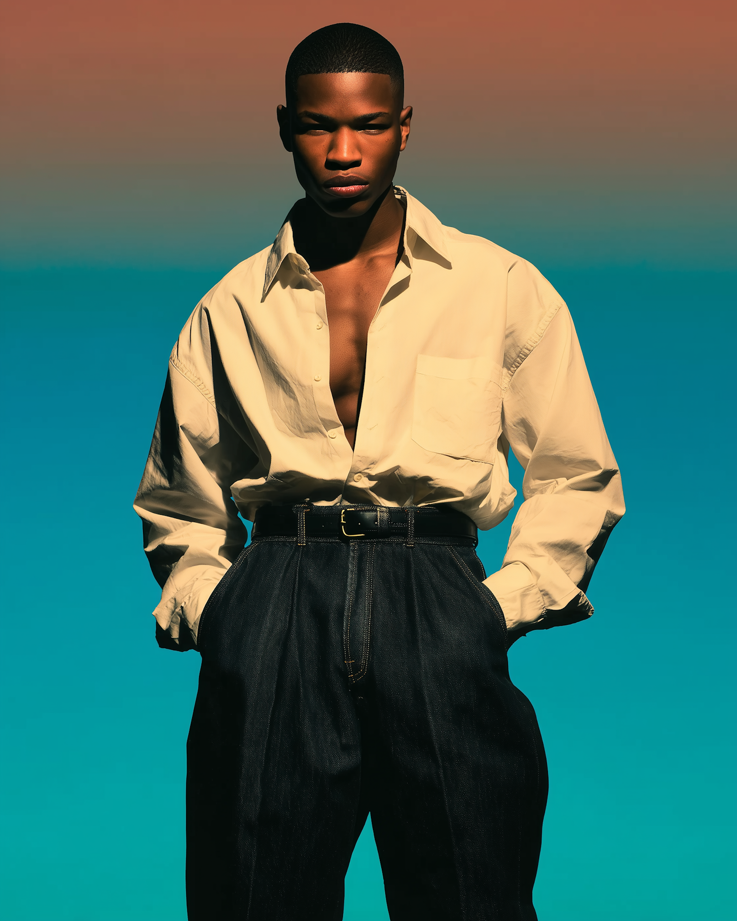 A stylish individual in a cream shirt and dark trousers stands against a vibrant gradient background, exuding modern elegance.