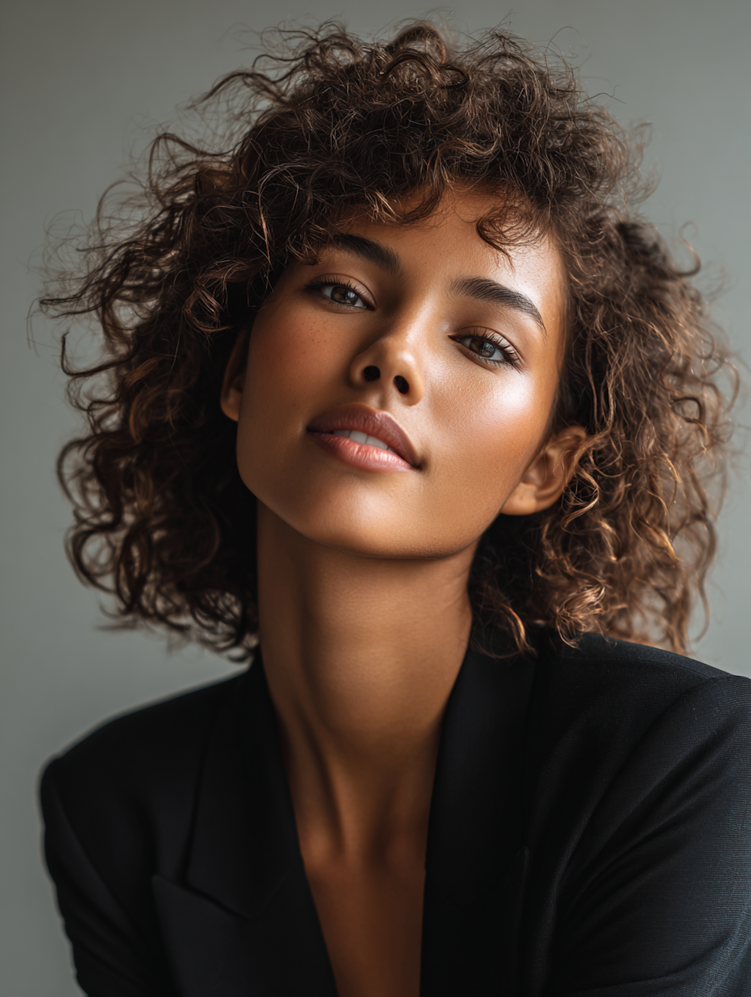 Portrait of a person with curly brown hair and a black blazer, set against a neutral background, showcasing a calm and confident expression.