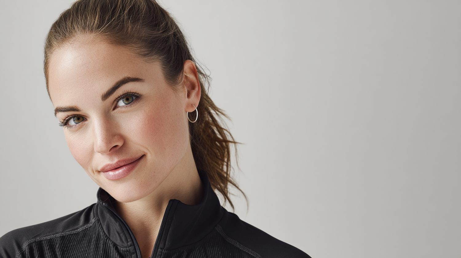 Close-up portrait of a woman with green eyes, brown hair, and a black zip-up top, set against a neutral gray background.