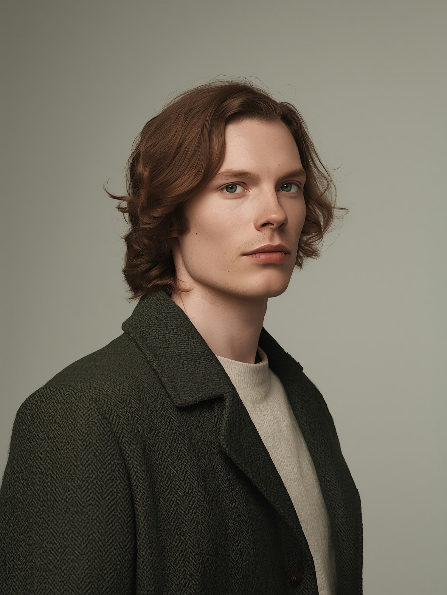 Portrait of a young adult with light brown wavy hair, wearing a green coat and beige sweater, set against a neutral gray background.