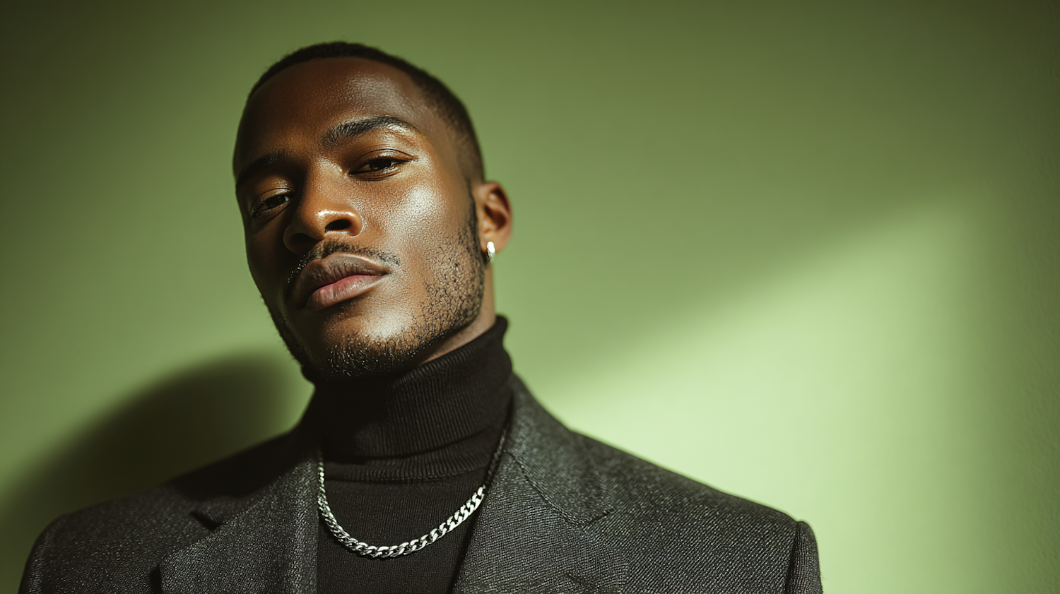 Stylish portrait of a man in a dark blazer and turtleneck, accessorized with a silver chain, set against a green background.