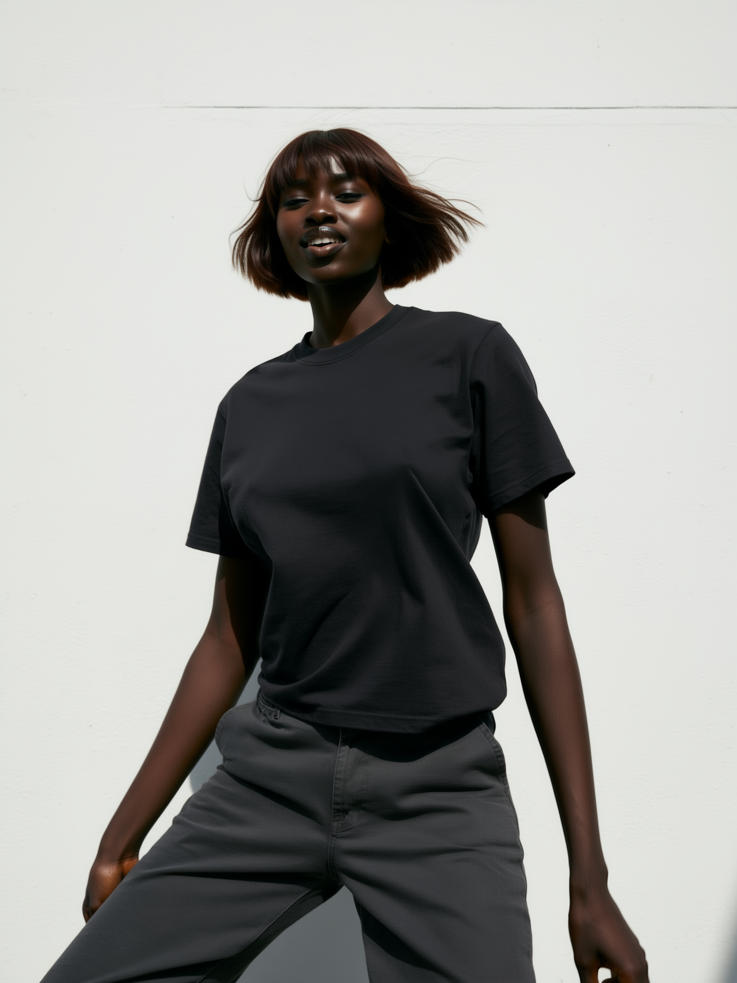 A person in a black t-shirt and gray pants stands confidently against a white background, with bright lighting highlighting their features.