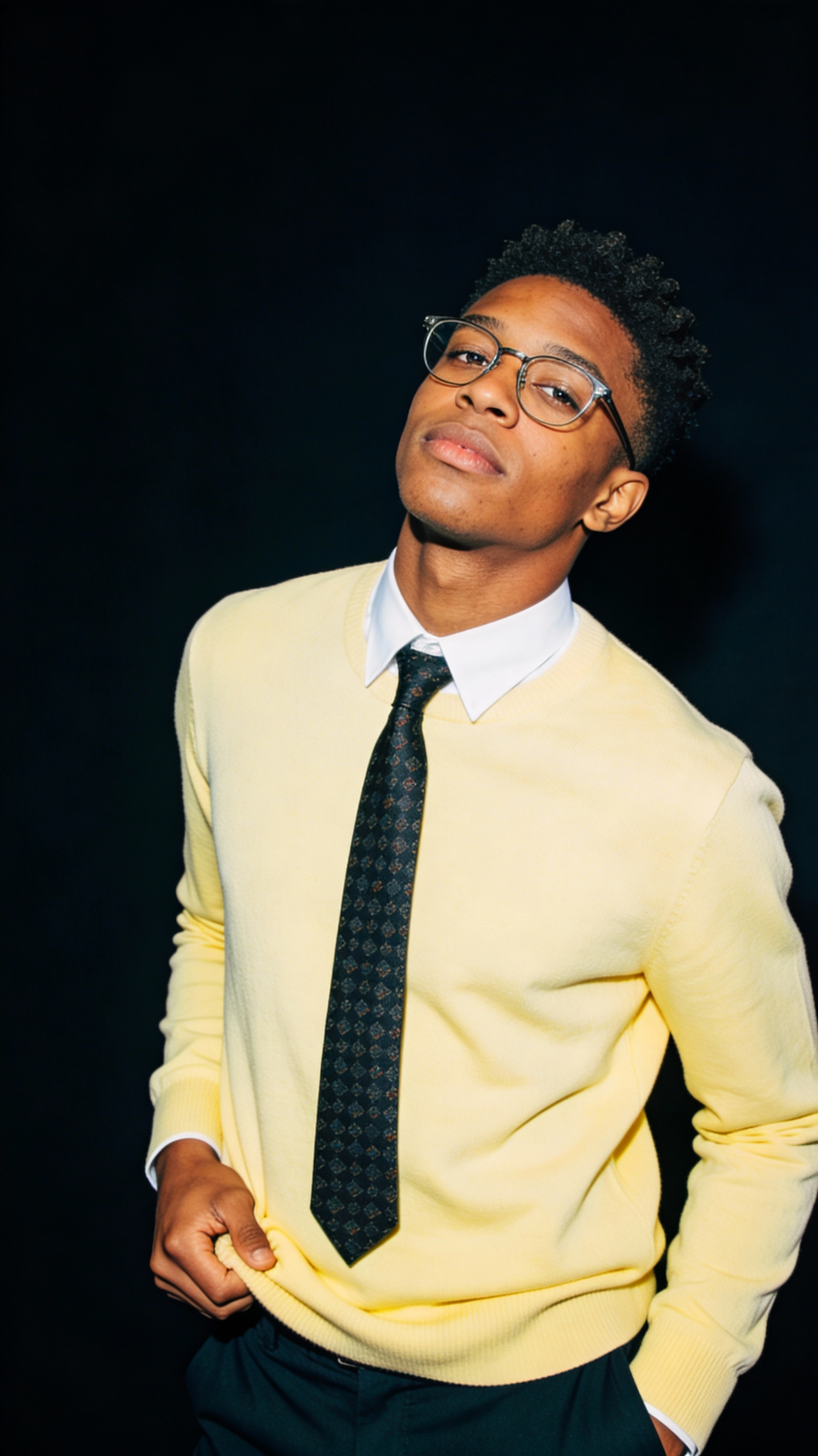 A stylish young man in a yellow sweater and tie poses confidently against a dark background, showcasing a modern and polished look.
