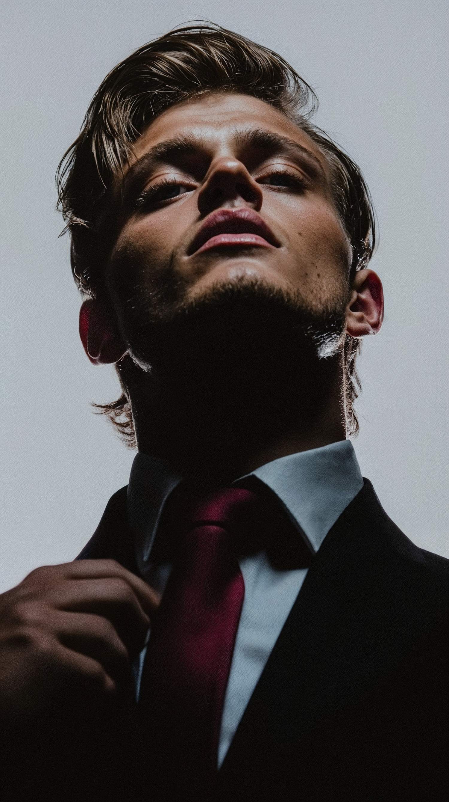 Low-angle portrait of a man in a suit adjusting his red tie, with dramatic lighting emphasizing his sharp features.