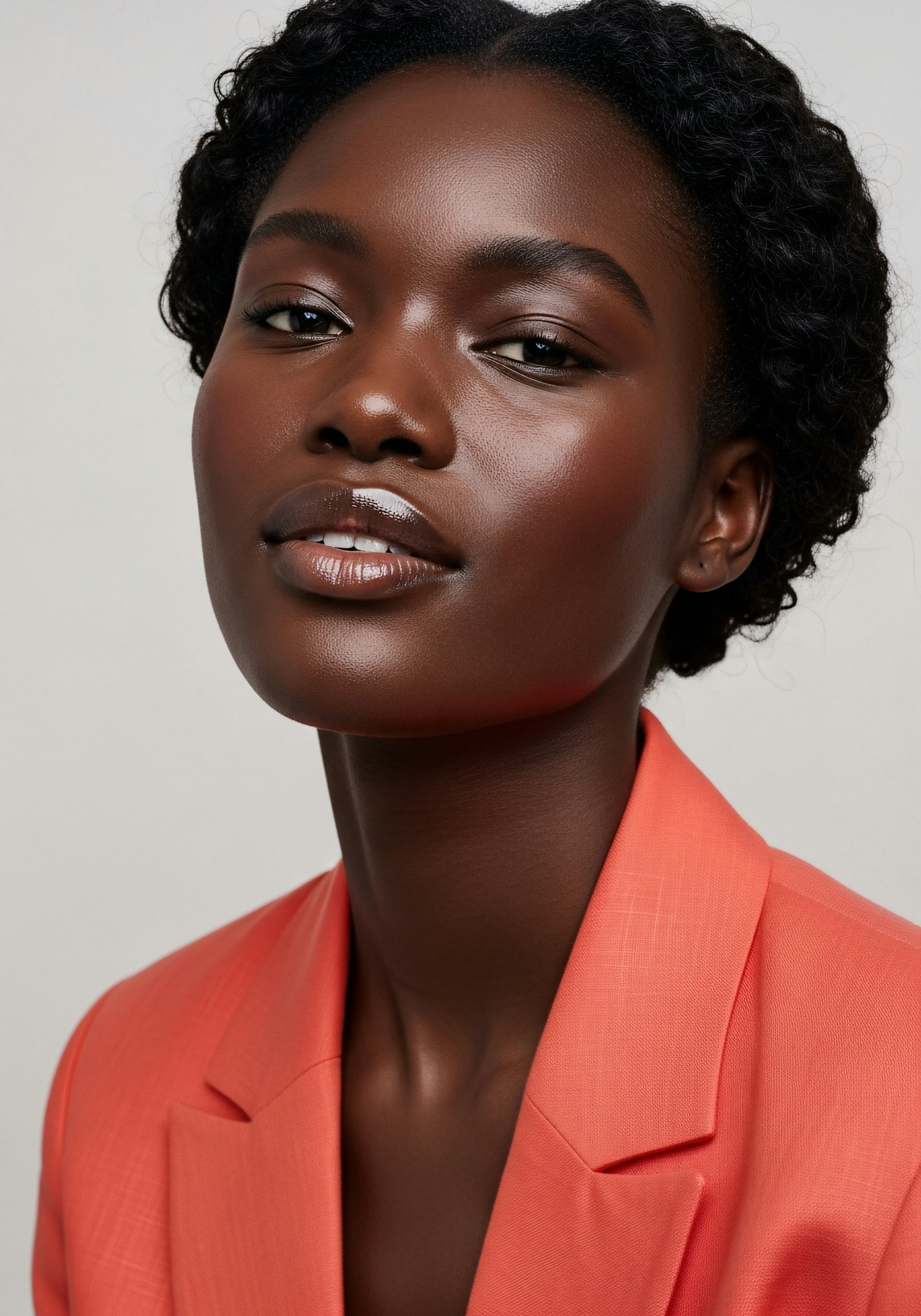 A close-up portrait of a person in a coral blazer, showcasing their confident expression and vibrant attire against a neutral background.
