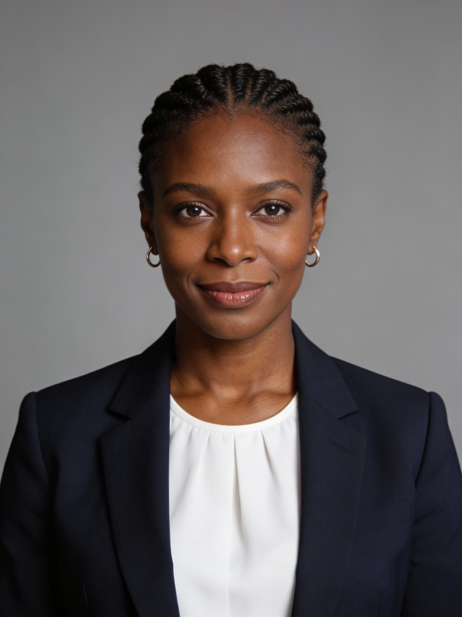 Studio portrait of a Kenyan Maasai female financial consultant, age 35; deep brown skin, warm undertone; tightly braided hair styled back from the face; elegant small hoop earrings; tailored dark navy blazer over a crisp white blouse with a modest round neckline; neutral mid-gray seamless backdrop; Rembrandt lighting with soft fill; 105 mm macro-sharp. Expression: poised and analytical, subtle closed-mouth smile with focused gaze. Framing: portrait orientation, 3:4 ratio; mid-chest-up composition. Subject centered, camera at eye level, front view. Full head and hair completely inside the frame with a little space above; both shoulders visible, no cropping at top or sides. Neutral studio composition, no props.