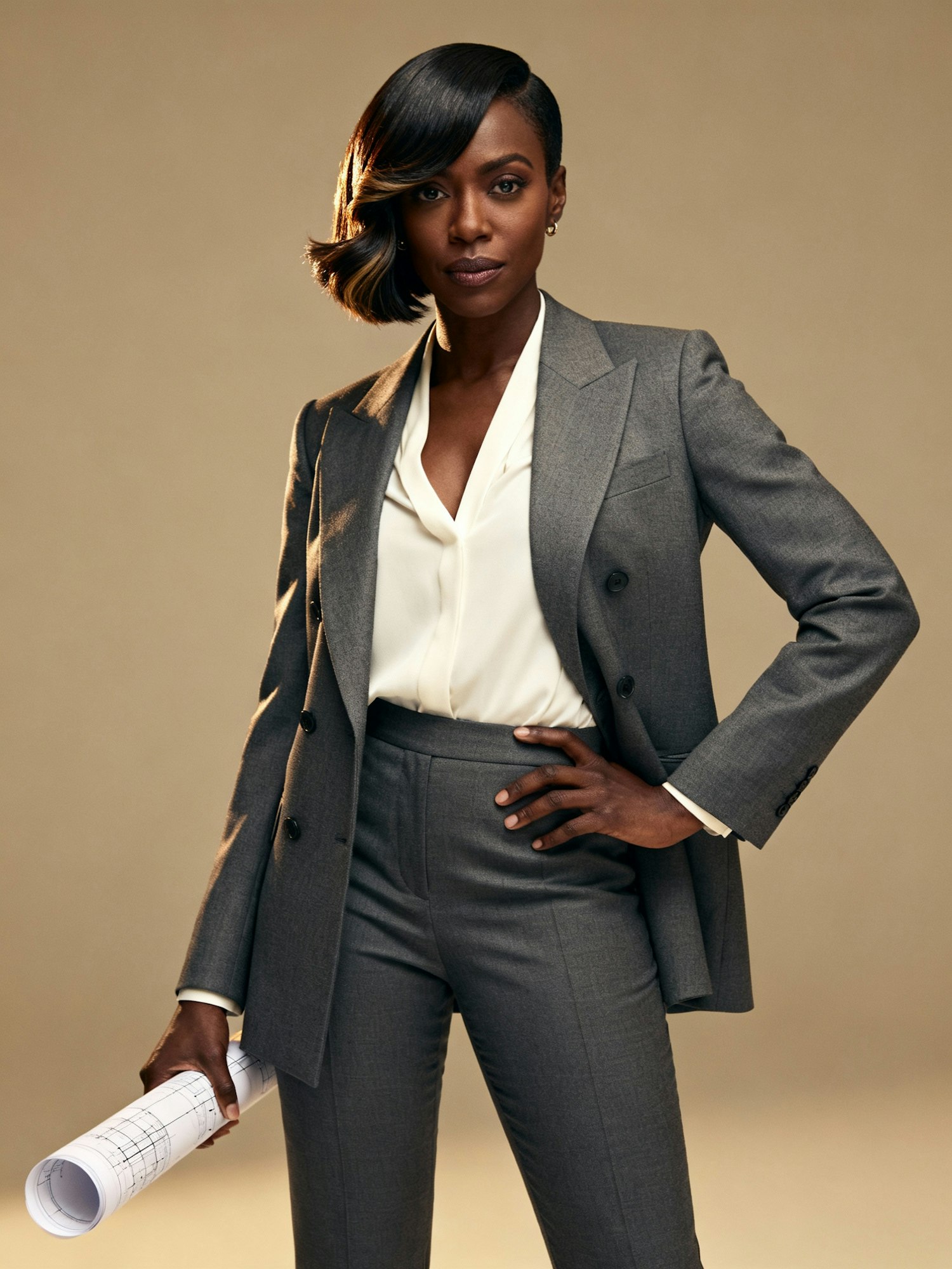 Cinematic portrait of a stylish Black female architect wearing a tailored slate-gray blazer over an ivory blouse and fitted trousers. Her hair is styled in a trending bob with subtle waves and a deep side part, sleek and perfectly shaped. She holds a rolled architectural blueprint in one hand and stands against a muted sand-colored background that complements her outfit. Soft, directional lighting accentuates her hair, the textures of her blazer, and her confident, focused expression. The mood is contemporary, polished, and fashion-forward—professionalism meets high-fashion editorial energy.