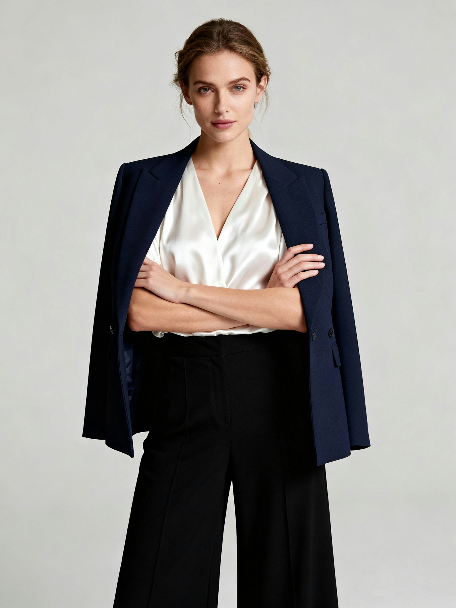 A confident woman in a navy blazer, white blouse, and black trousers stands against a neutral background, exuding professionalism.