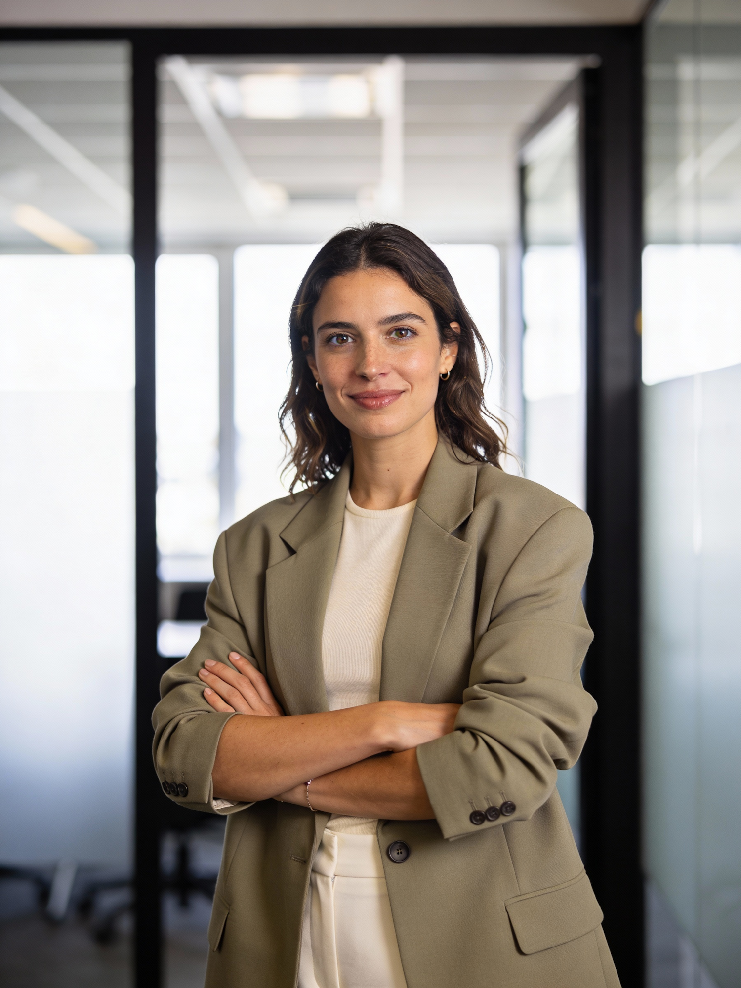 Confident professional woman in a beige blazer, standing in a modern office with glass partitions, exuding a composed and approachable demeanor.