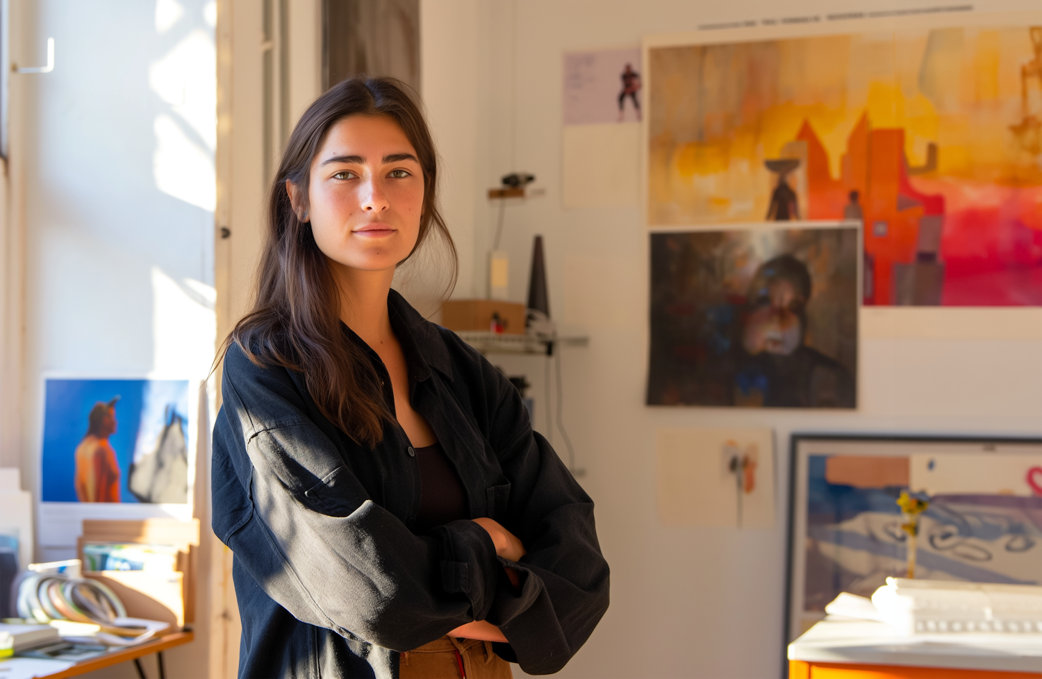 Young woman in an art studio with colorful paintings, natural light, and a creative atmosphere.