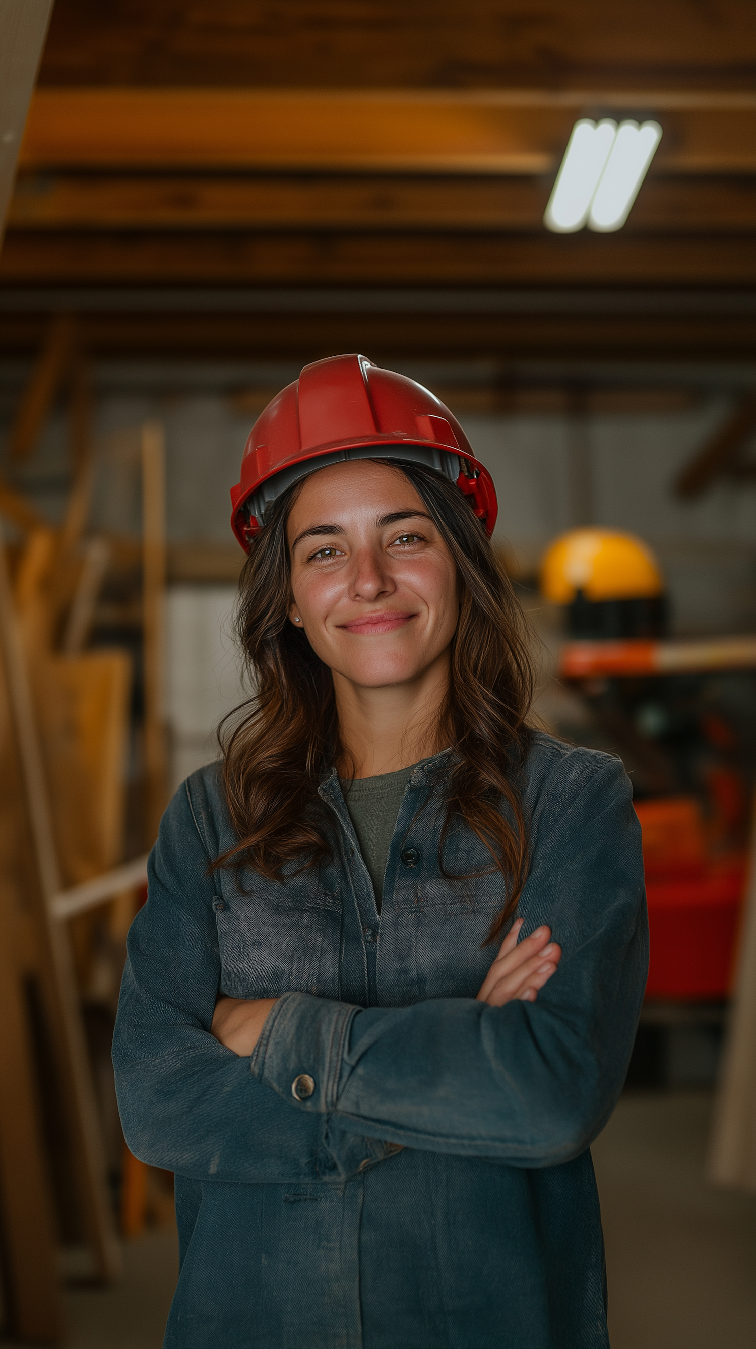 Confident woman in a red hard hat and denim jacket, standing in a workshop with crossed arms and a friendly smile.