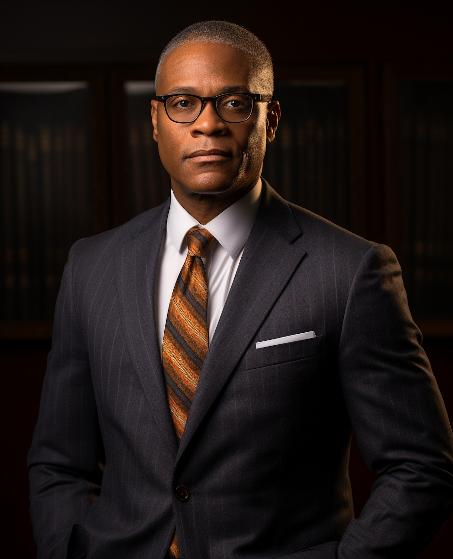 Confident Black man in a gray pinstripe suit with orange tie, glasses, and a serious expression in a professional setting.