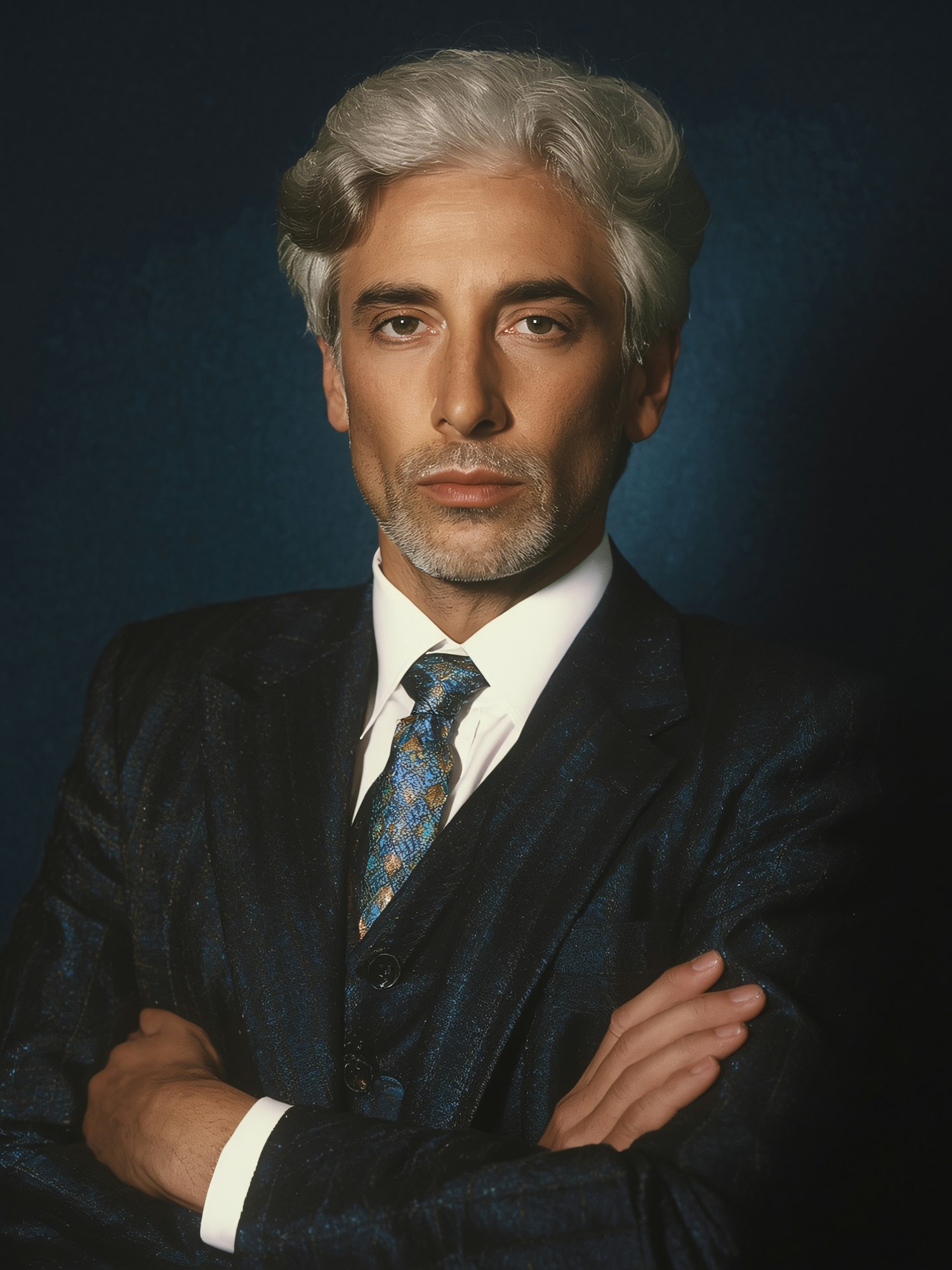 A man with silver hair and a formal suit poses confidently against a dark blue background, exuding professionalism and style.