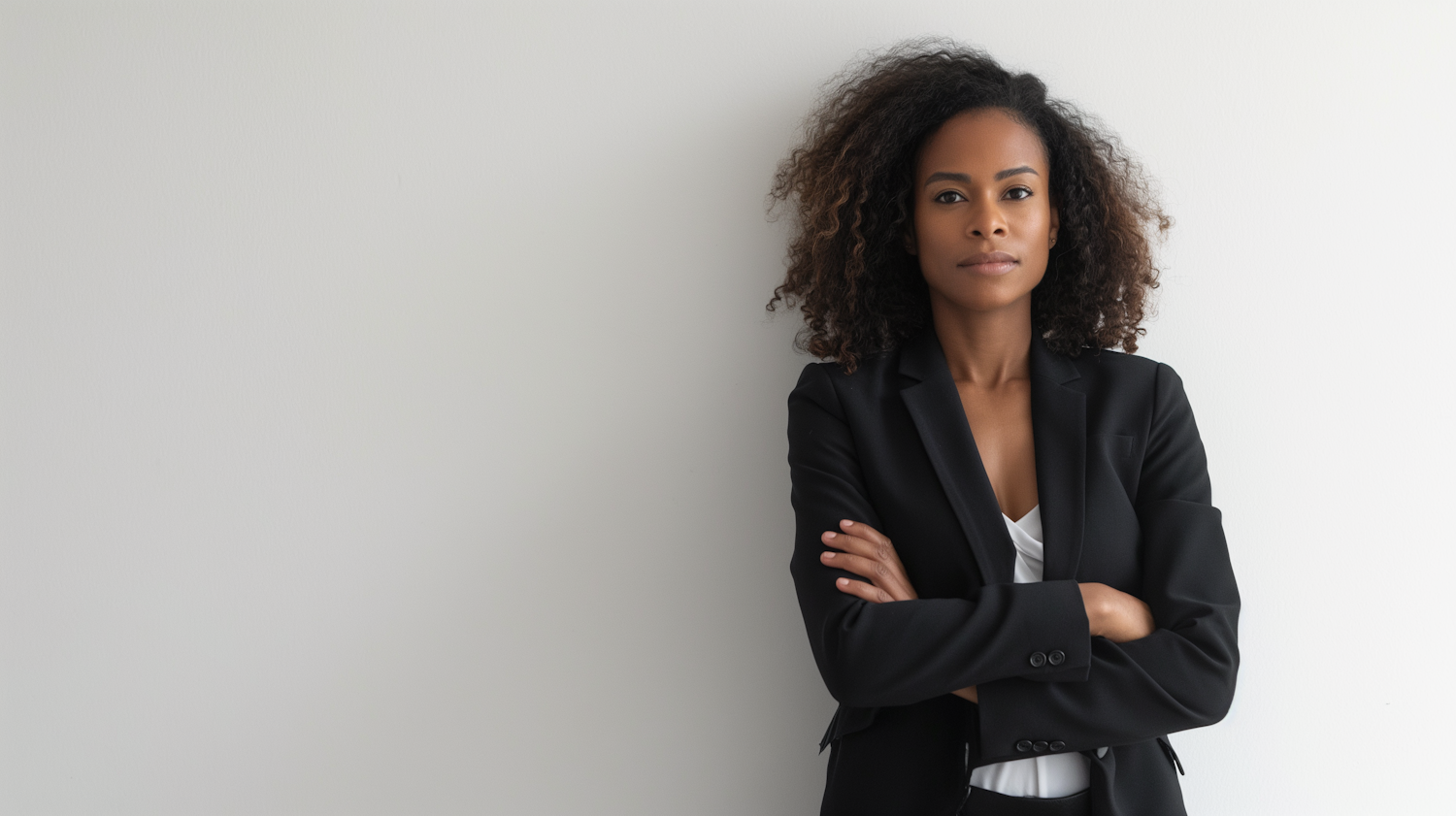 Confident Black woman in a black blazer with curly hair, standing against a white background, exuding professionalism and poise.