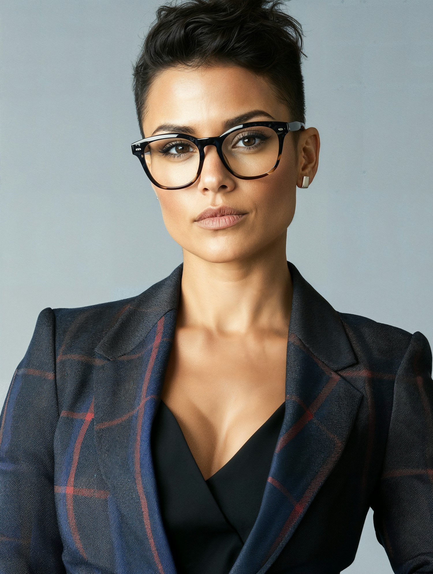 Confident woman with short hair and glasses in a plaid blazer, exuding style and professionalism.