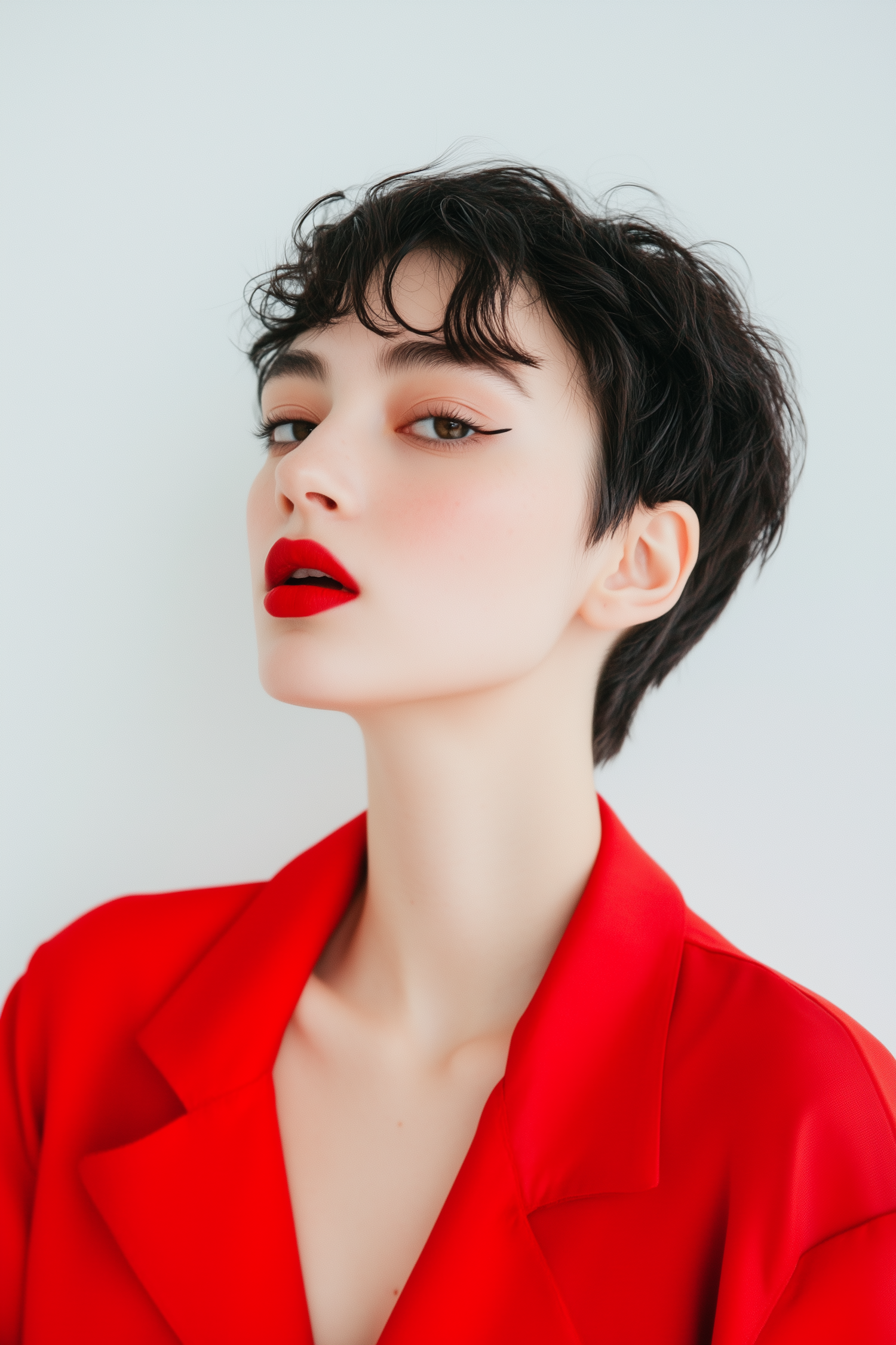 Close-up of a woman with short dark hair, bold red lipstick, and a matching red blazer, set against a light gray background.