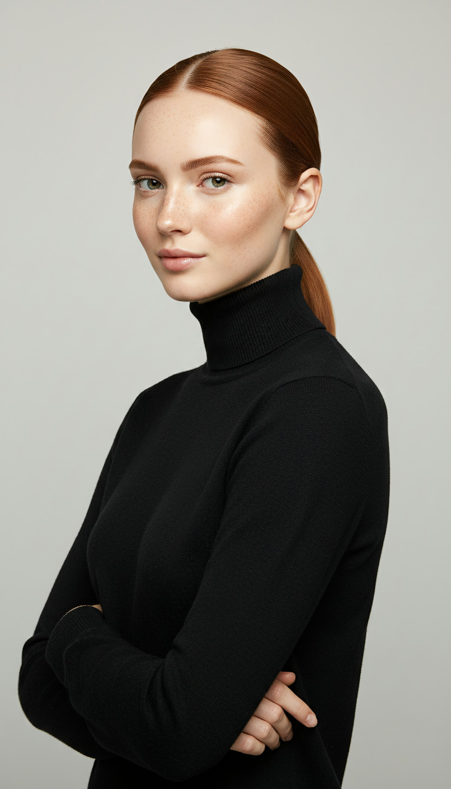 A young woman with red hair and freckles, wearing a black turtleneck, poses confidently against a neutral background.