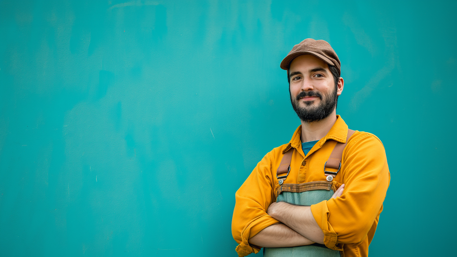 Man in mustard shirt and green overalls with a brown cap, standing against a teal background, arms crossed, smiling confidently.