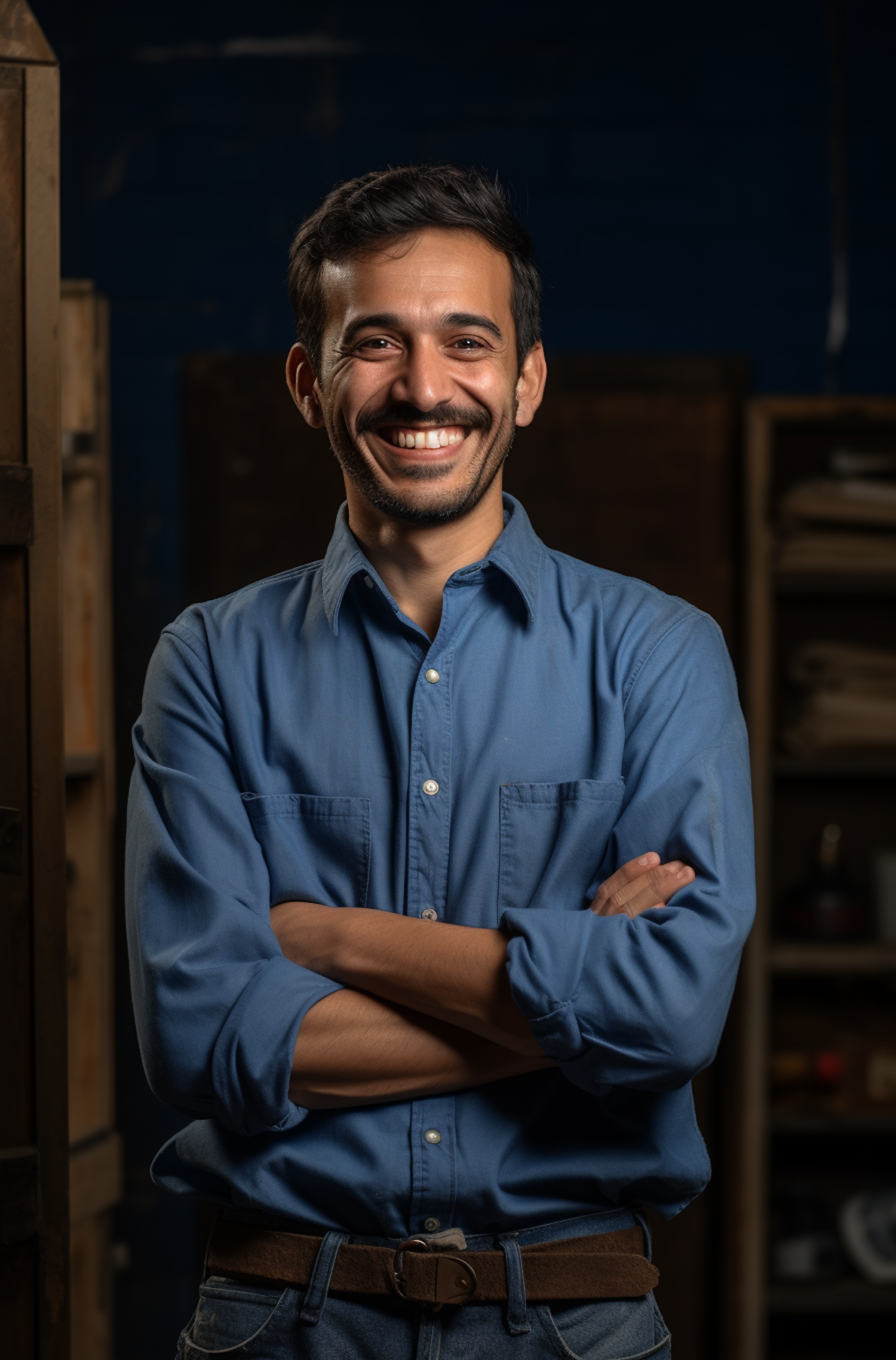 Smiling man in a blue shirt with arms crossed, standing in a workshop setting with shelves and crates in the background.