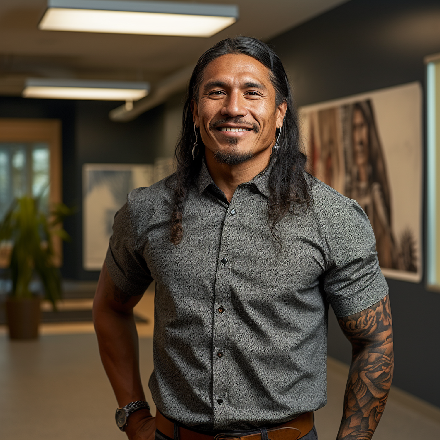 Confident man with tattoos and long hair in a stylish shirt, standing in a well-lit indoor setting with artwork in the background.