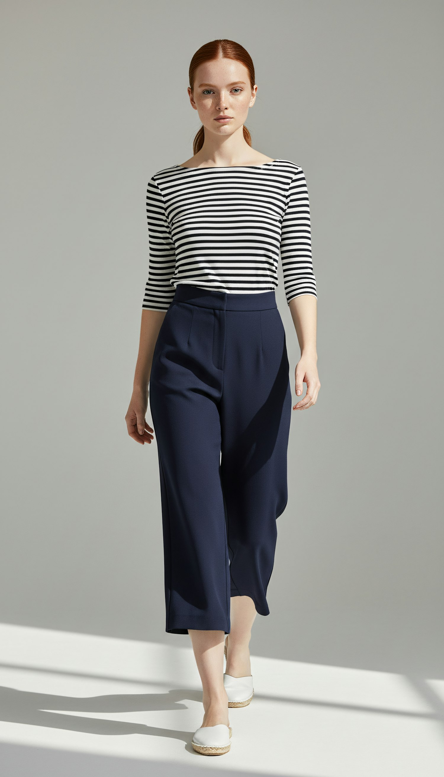 A woman in a striped top and navy trousers walks confidently in a minimalist setting with soft lighting.