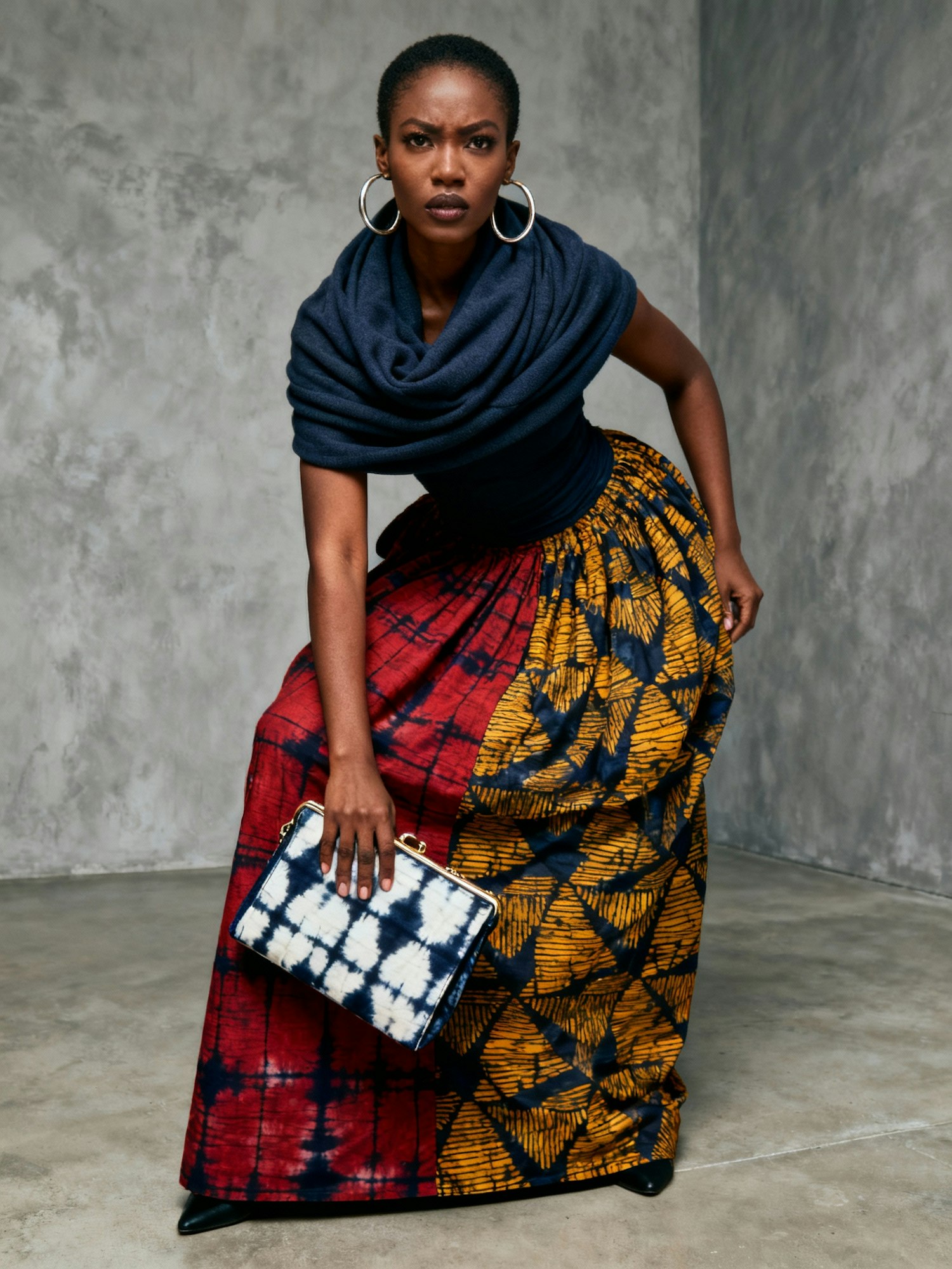 Here is the cleaned-up and refined prompt: "**Close-up, cinematic, high-definition professional portrait** of a woman, radiating fierce elegance and strength. She is captured in a dynamic and dramatic pose. She wears a **stylishly wrapped jersey scarf** and striking large hoop earrings. The portrait showcases her unique, high-fashion ensemble: a **full-length African print bubu** made from a **two-colored Adire fabric**. She carries a **clutch bag** crafted from the same Adire fabric, emphasizing her avant-garde style. The background is a minimalist composition of textured gray walls and a smooth concrete floor. Soft, even lighting meticulously highlights the rich textures of her garment and the intensity of her expression. The style is cinematic, sharply focused, and exudes an artistic high-fashion vibe that emphasizes her bold presence."