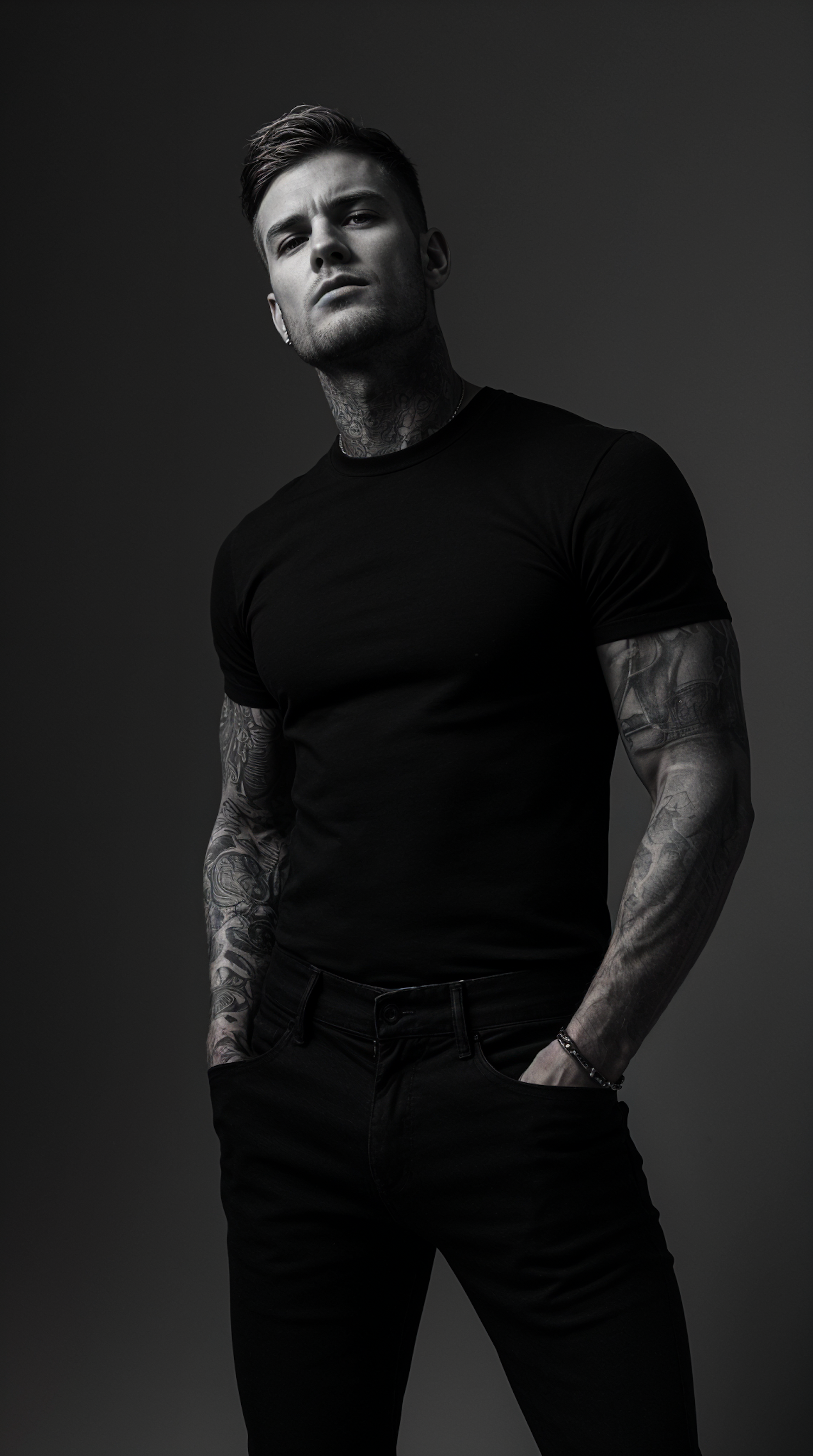 Muscular man with tattoos in black attire, striking a confident pose against a dark background.