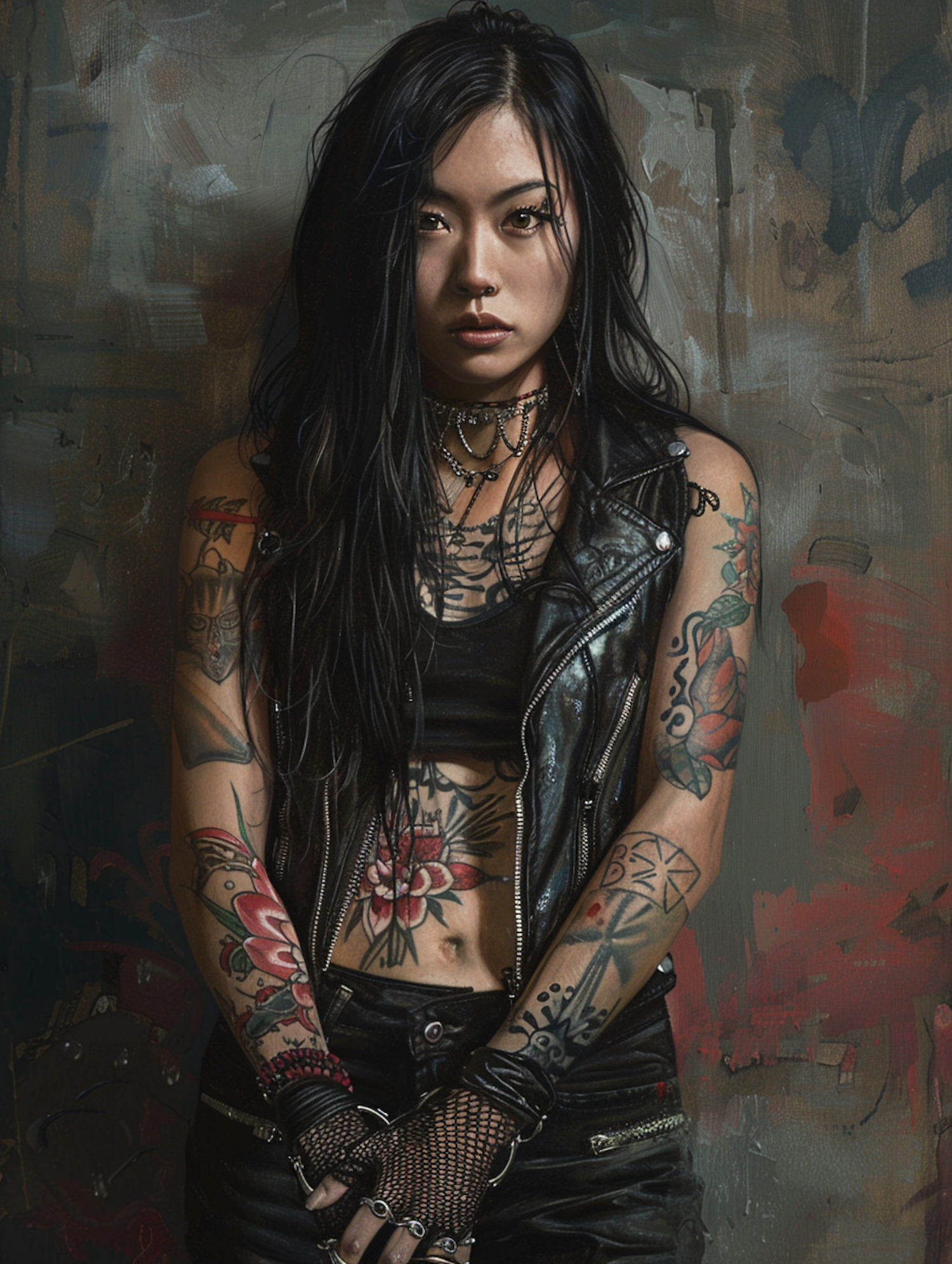 Asian woman with tattoos and leather vest, exuding a rebellious vibe against a graffiti backdrop. Intense expression and intricate body art.
