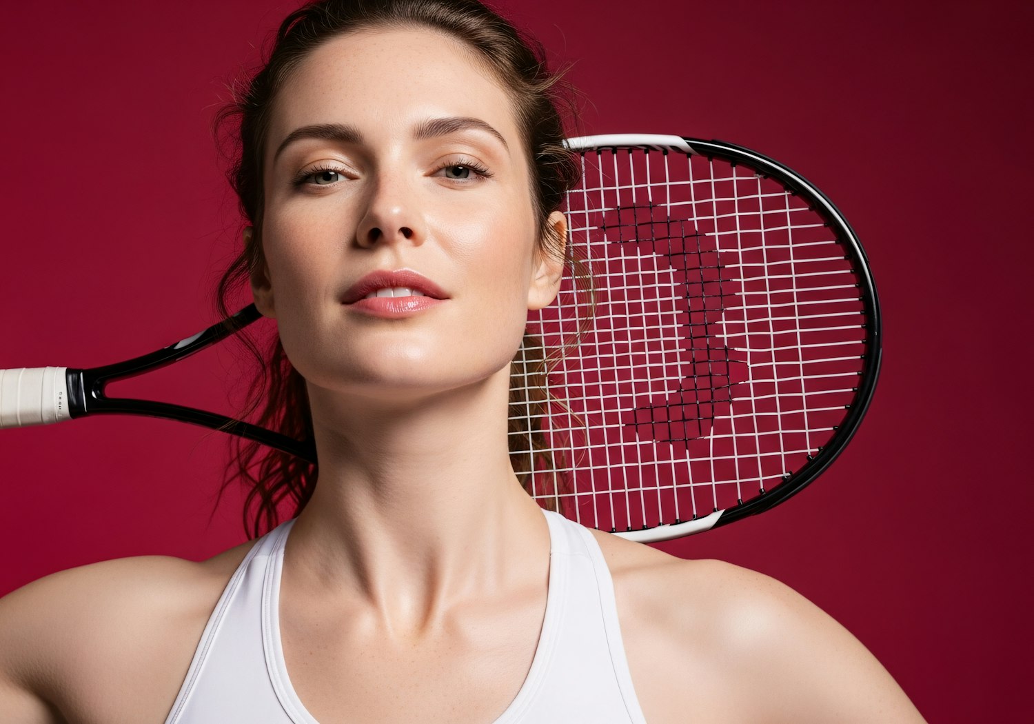 A confident woman with a tennis racket over her shoulder, set against a bold red background, showcasing a sporty and vibrant aesthetic.