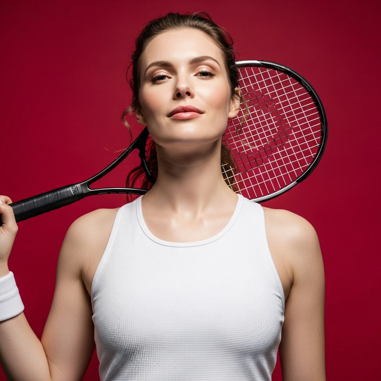 A confident woman in a white athletic top poses with a tennis racket against a bold red background, embodying a sporty and stylish vibe.